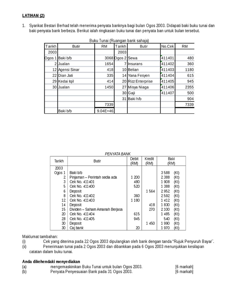 Penyata penyesuaian bank akan disediakan apabila baki yang ditunjukkan dalam Penyata Bank tidak sama dengan baki dalam Buku Tunai bagi bulan berkenaan. Butiran Cek Belum Dikemukakan dikelaskan sebagai Deposit Belum Dikreditkan dan sebaliknya Item-item TAMBAH dicatat sebagai TOLAK dan sebaliknya. 34 rows PENYATA PENYESUAIAN BANK BANK RECONCILIATION a.